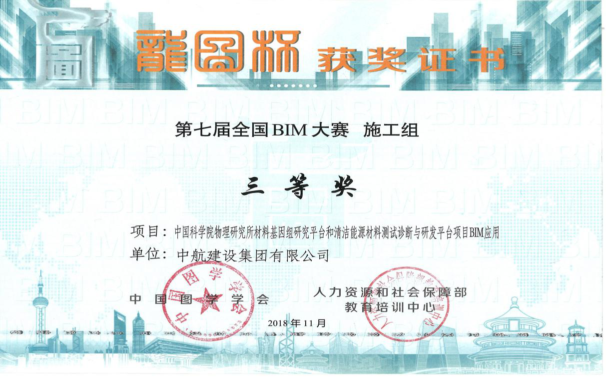11月29日,在中國圖學學會于國家會議中心召開的第七屆“龍圖杯”全國BIM大賽頒獎典禮及高峰論壇上,我集團公司的“中國科學院物理研究所材料基因組研究平臺和清潔能源材料測試診斷與研發平臺項目BIM應用”成果及“科研及附屬用房等2項項目BIM應用”成果分別獲得三等獎和優秀獎。