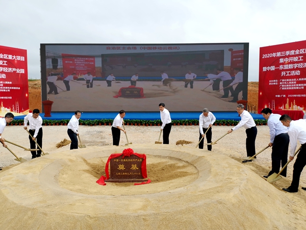 9月28日上午,中國—東盟數字經濟產業園開工活動在廣西壯族自治區南寧市舉行,廣西壯族自治區黨委常委、常務副主席秦如培出席儀式并宣布項目開工。自治區副主席劉宏武,自治區政府副秘書長黃勝杰,自治區發改委副主任潘巍,南寧市政府副市長朱會東,廣投集團黨委書記、董事長周煉,自治區大數據發展局副局長吳志偉,數字廣西集團執行總裁、廣西數字經濟生態產業公司董事長靳芳,集團公司黨委書記、董事長陳先瑞共同出席活動并為項目奠基培土。
