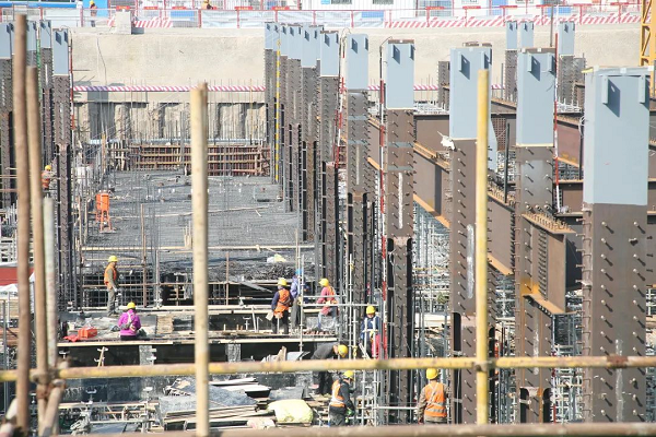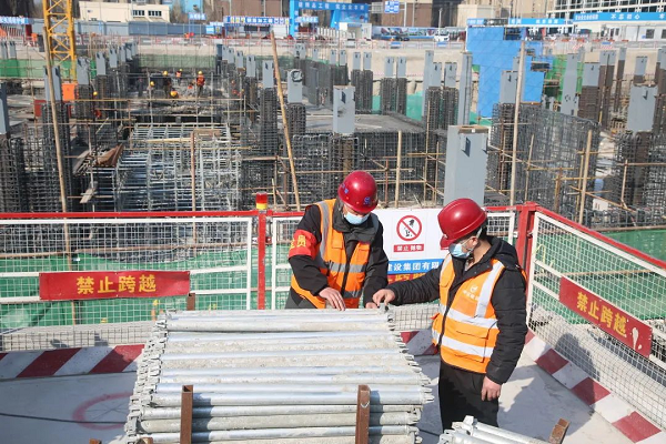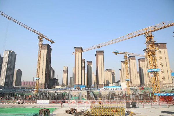 走進(jìn)工地,一個巨大的基坑映入眼簾,隨處都是忙碌施工的工人和大型器械。伴著微微轟鳴聲,3臺塔吊正在接續(xù)不斷地向基坑內(nèi)吊運(yùn)建筑材料,工人們正在進(jìn)行地下一層、地下二層的鋼筋綁扎作業(yè),工程進(jìn)展緊張有序、忙而不亂。